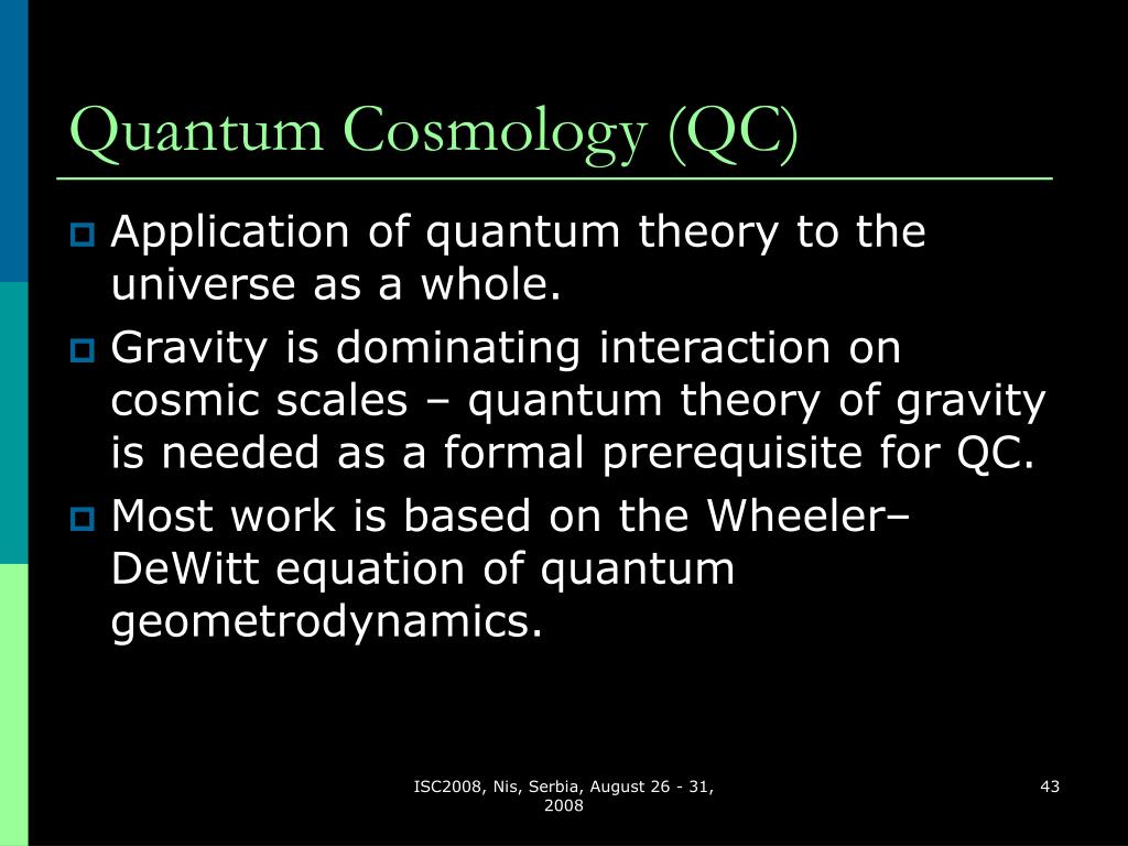 Quantum Cosmology (QC) • Application of quantum theory to the universe as a whole. • Gravity is dominating interaction on cosmic scales – quantum theory of gravity is needed as a formal prerequisite for QC. • Most work is based on the Wheeler–DeWitt equation of quantum geometrodynamics. ISC2008, Nis, Serbia, August 26 - 31, 2008