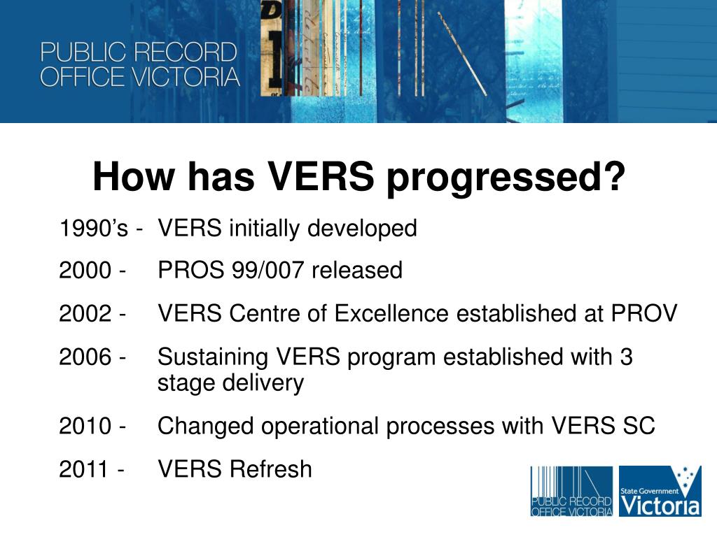 How has VERS progressed? • 1990’s - VERS initially developed • 2000 - PROS 99/007 released • 2002 - VERS Centre of Excellence established at PROV • 2006 - Sustaining VERS program established with 3 stage delivery • 2010 - Changed operational processes with VERS SC • 2011 - VERS Refresh
