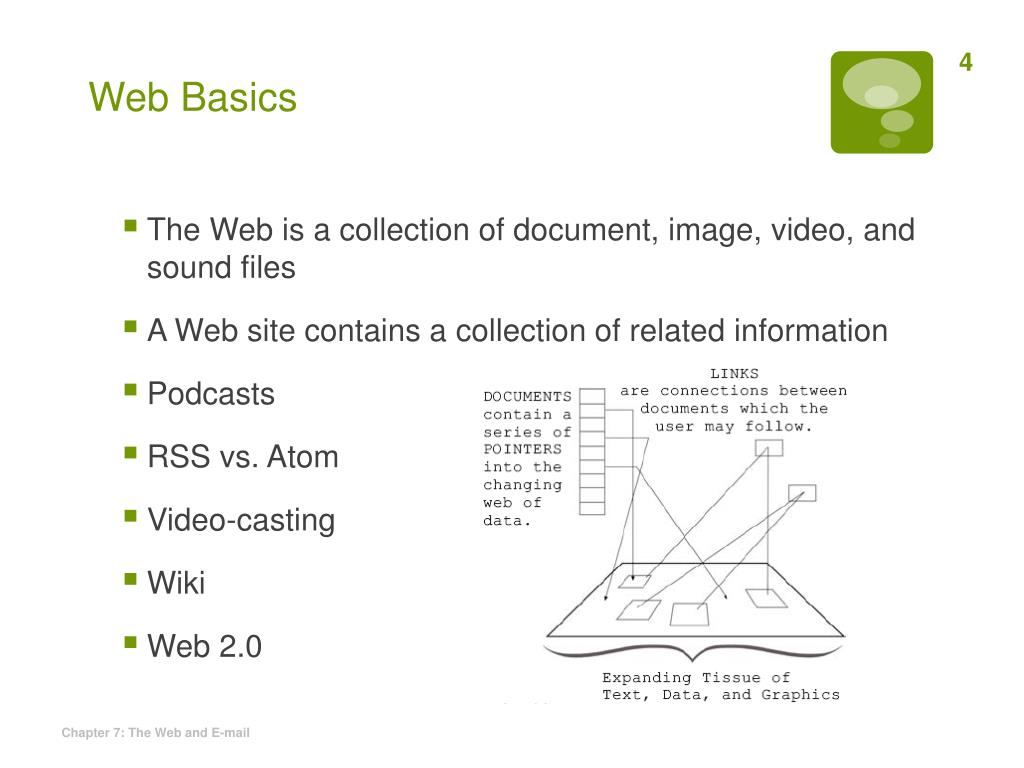 Web Basics The Web is a collection of document, image, video, and sound files A Web site contains a collection of related information Podcasts RSS vs. Atom Video-casting Wiki Web 2.0 Chapter 7: The Web and E-mail