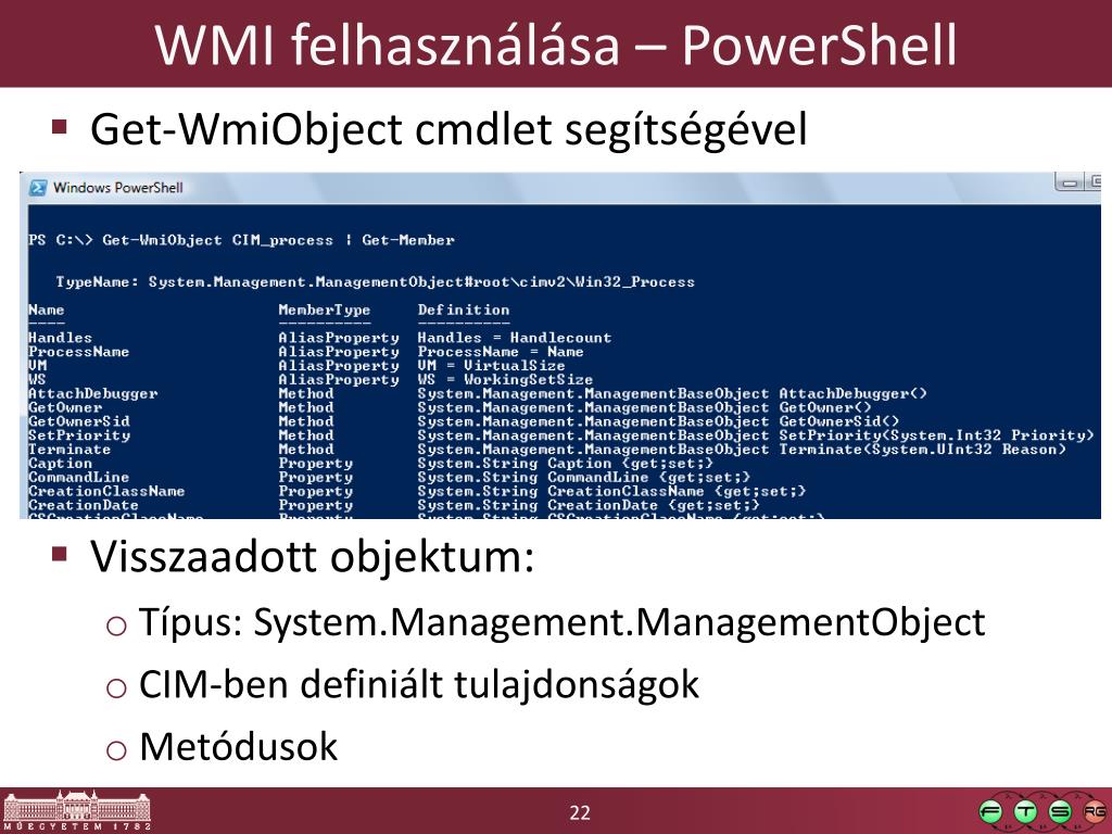 WMI felhasználása – PowerShell • Get-WmiObject cmdlet segítségével • Visszaadott objektum: • Típus: System.Management.ManagementObject • CIM-ben definiált tulajdonságok • Metódusok