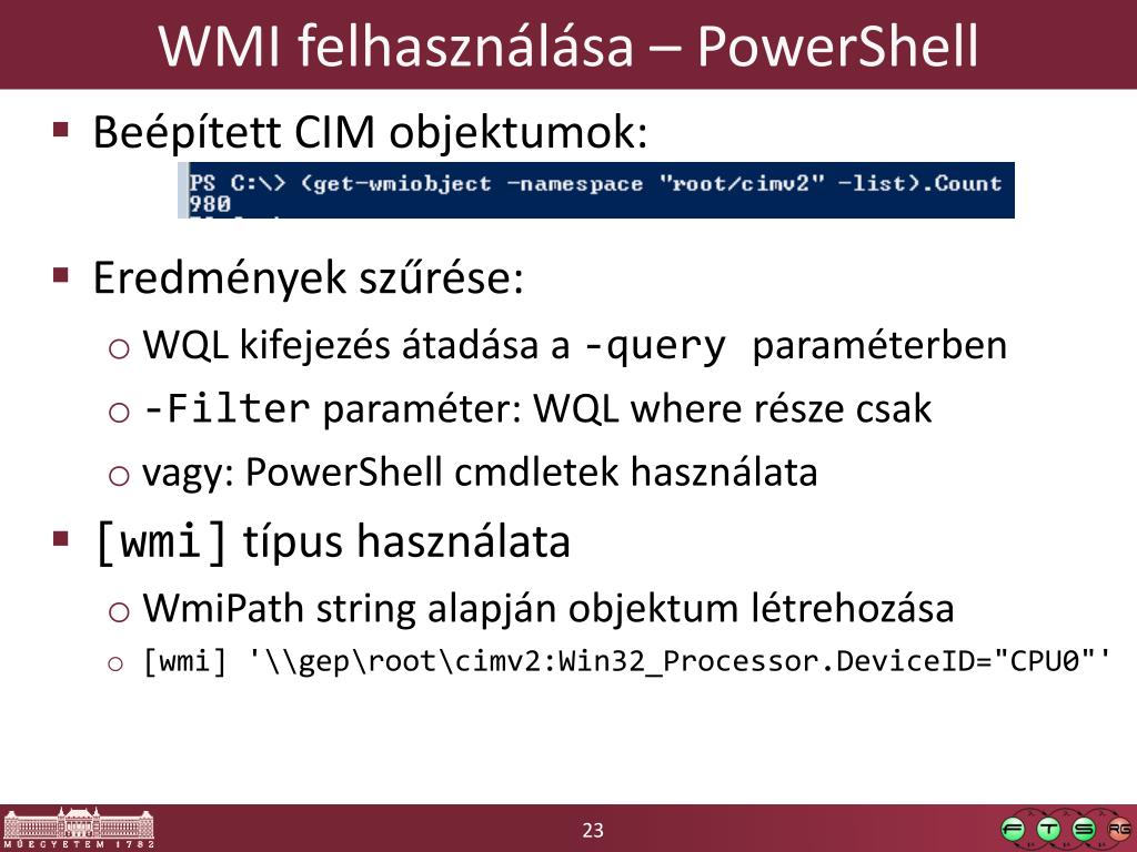 WMI felhasználása – PowerShell • Beépített CIM objektumok: • Eredmények szűrése: • WQL kifejezés átadása a -queryparaméterben • -Filter paraméter: WQL where része csak • vagy: PowerShellcmdletek használata • [wmi] típus használata • WmiPathstring alapján objektum létrehozása • [wmi] '\\gep\root\cimv2:Win32_Processor.DeviceID="CPU0"'