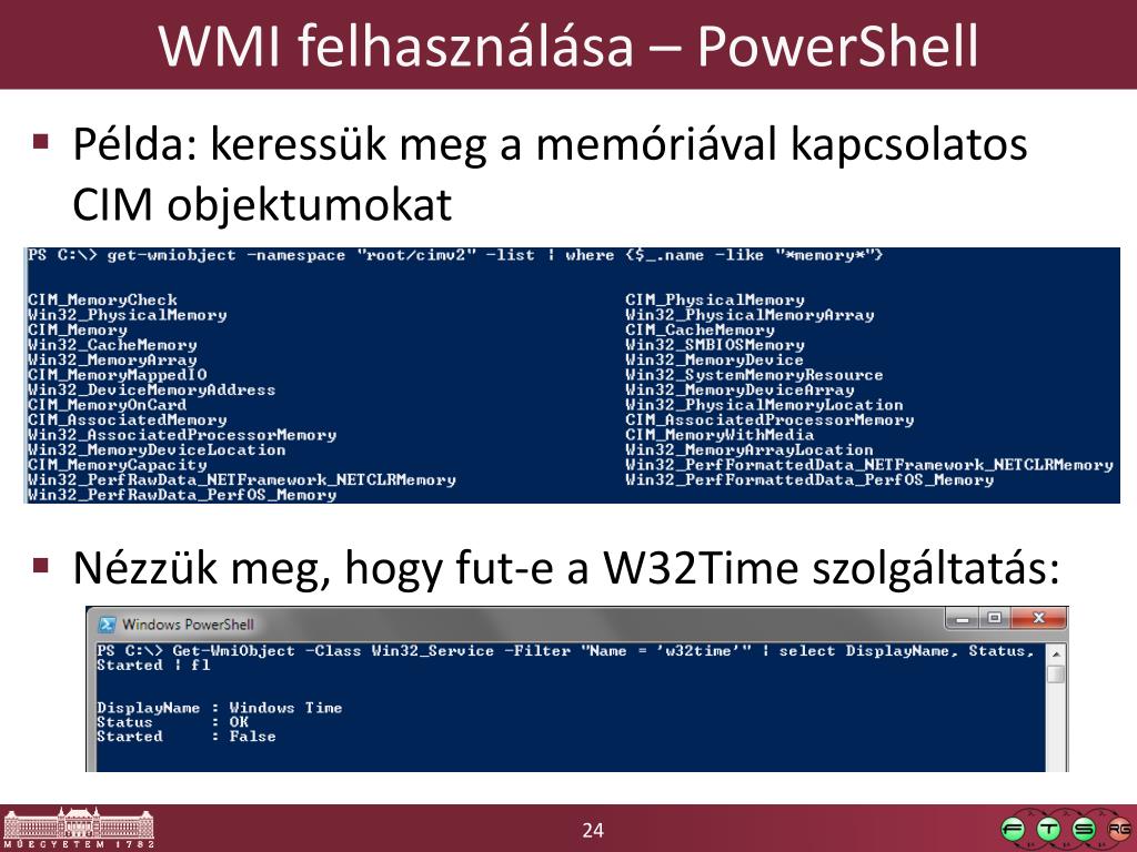 WMI felhasználása – PowerShell • Példa: keressük meg a memóriával kapcsolatos CIM objektumokat • Nézzük meg, hogy fut-e a W32Time szolgáltatás: