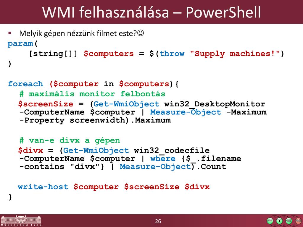 WMI felhasználása – PowerShell • Melyik gépen nézzünk filmet este? param( [string[]] $computers = $(throw "Supply machines!") ) foreach($computerin$computers){ # maximális monitor felbontás $screenSize= (Get-WmiObject win32_DesktopMonitor-ComputerName$computer | Measure-Object-Maximum-Propertyscreenwidth).Maximum # van-e divx a gépen $divx= (Get-WmiObject win32_codecfile-ComputerName$computer | where {$_.filename-contains "divx"} | Measure-Object).Count write-host$computer$screenSize$divx }