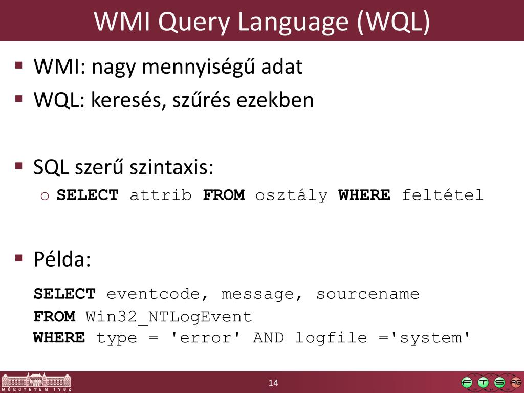 WMI QueryLanguage (WQL) • WMI: nagy mennyiségű adat • WQL: keresés, szűrés ezekben • SQL szerű szintaxis: • SELECTattribFROM osztály WHERE feltétel • Példa: SELECT eventcode, message, sourcenameFROM Win32_NTLogEventWHERE type = 'error' AND logfile ='system'