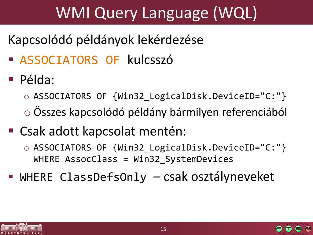WMI QueryLanguage (WQL) Kapcsolódó példányok lekérdezése • ASSOCIATORS OF kulcsszó • Példa: • ASSOCIATORS OF {Win32_LogicalDisk.DeviceID="C:"} • Összes kapcsolódó példány bármilyen referenciából • Csak adott kapcsolat mentén: • ASSOCIATORS OF {Win32_LogicalDisk.DeviceID="C:"} WHERE AssocClass = Win32_SystemDevices • WHERE ClassDefsOnly– csak osztályneveket
