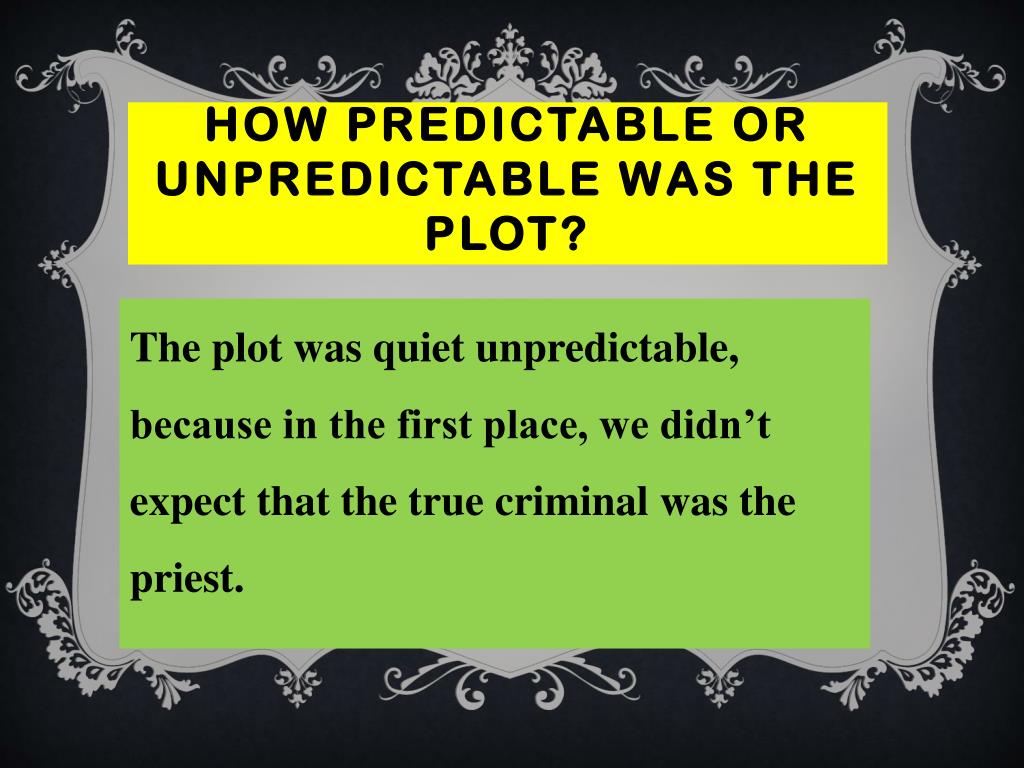 How predictable or unpredictable was the plot? The plot was quiet unpredictable, because in the first place, we didn’t expect that the true criminal was the priest.
