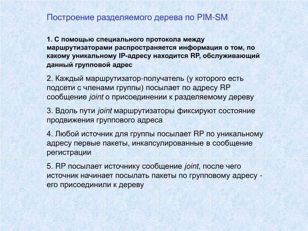 Построение разделяемого дерева по PIM-SM 1. C помощью специального протокола между маршрутизаторами распространяется информация о том, по какому уникальному IP-адресу находится RP, обслуживающий данный групповой адрес 2. Каждый маршрутизатор-получатель (у которого есть подсети с членами группы) посылает по адресу RP сообщение jointо присоединении к разделяемому дереву 3. Вдоль пути jointмаршрутизаторы фиксируют состояние продвижения группового адреса 4. Любой источник для группы посылает RP по уникальному адресу первые пакеты, инкапсулированные в сообщение регистрации 5. RP посылает источнику сообщение joint, после чего источник начинает посылать пакеты по групповому адресу - его присоединили к дереву