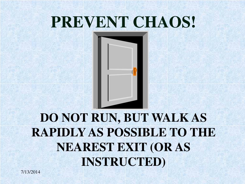 PREVENT CHAOS!DO NOT RUN, BUT WALK AS RAPIDLY AS POSSIBLE TO THE NEAREST EXIT (OR AS INSTRUCTED)