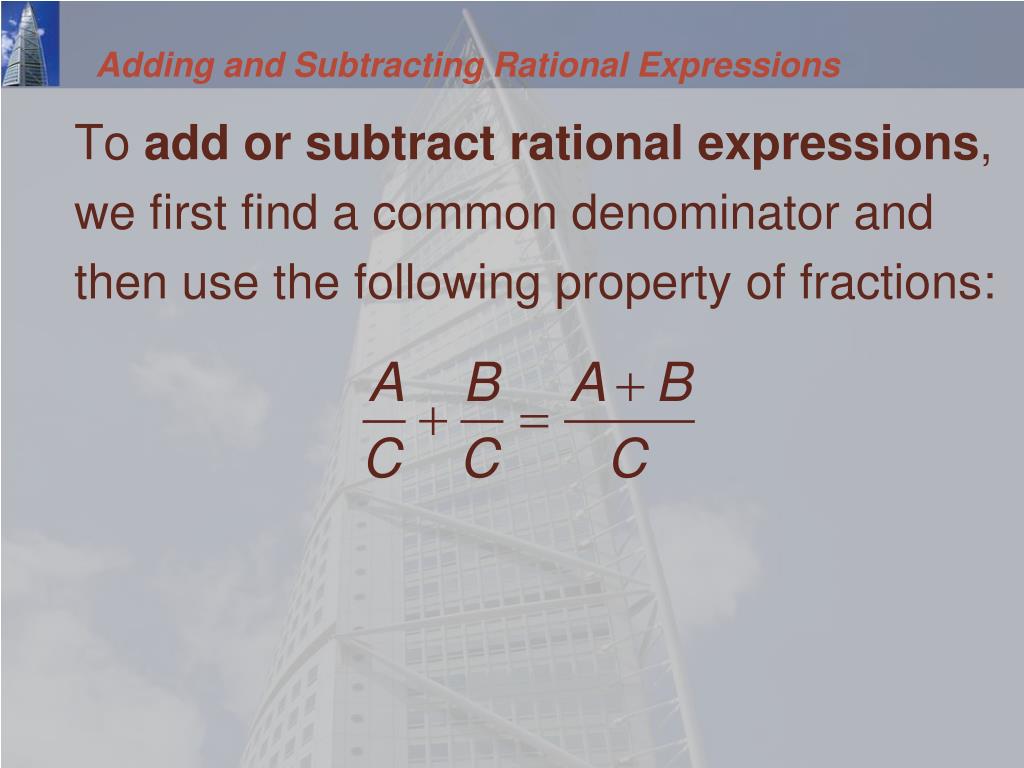 Adding and Subtracting Rational Expressions • To add or subtract rational expressions, we first find a common denominator and then use the following property of fractions: