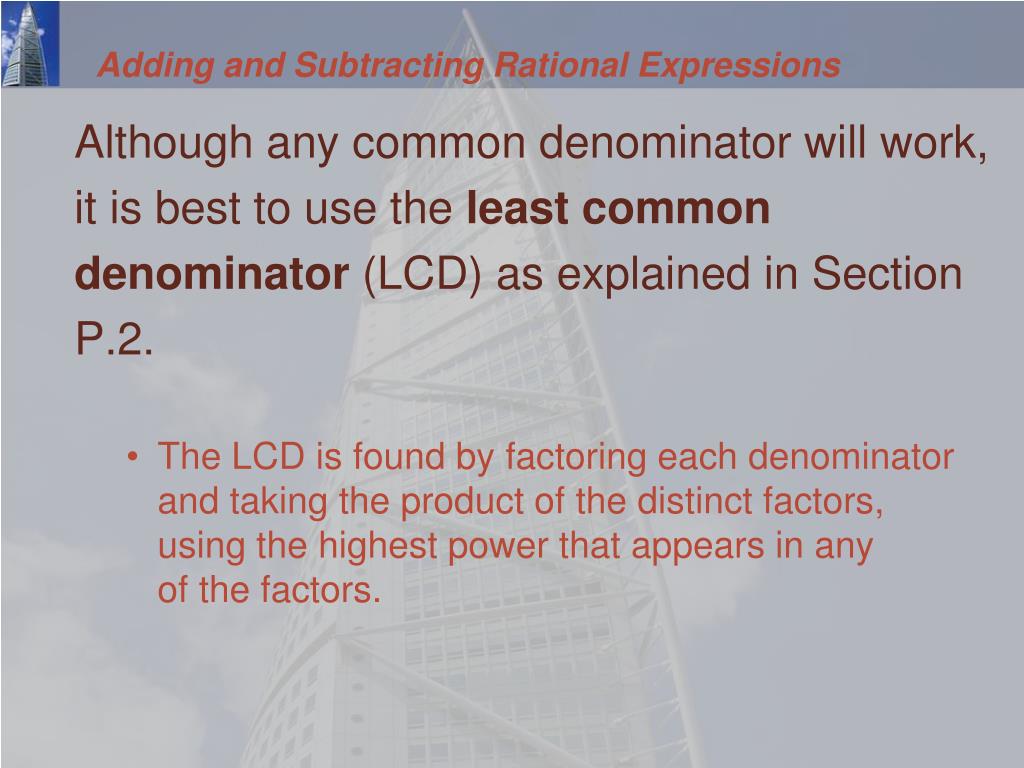 Adding and Subtracting Rational Expressions • Although any common denominator will work, it is best to use the least common denominator (LCD) as explained in Section P.2. • The LCD is found by factoring each denominator and taking the product of the distinct factors, using the highest power that appears in any of the factors.