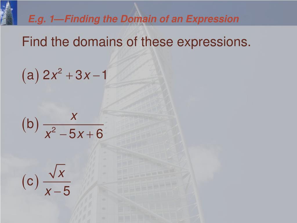 E.g. 1—Finding the Domain of an Expression • Find the domains of these expressions.