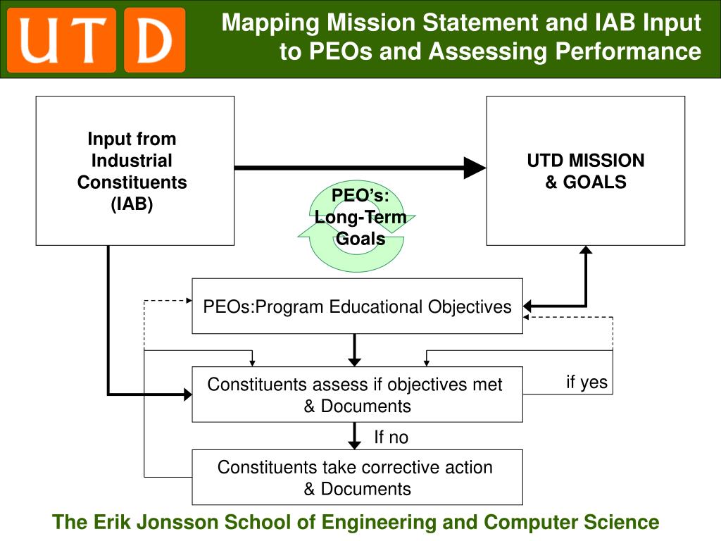 UTD MISSION & GOALS Input from Industrial Constituents (IAB) PEOs:Program Educational Objectives Constituents assess if objectives met & Documents if yes If no Constituents take corrective action & Documents Mapping Mission Statement and IAB Input to PEOs and Assessing Performance