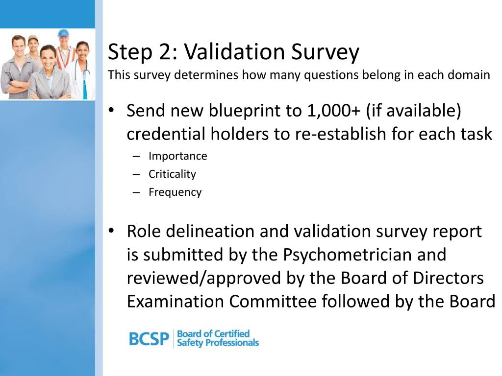Step 2: Validation SurveyThis survey determines how many questions belong in each domain • Send new blueprint to 1,000+ (if available) credential holders to re-establish for each task • Importance • Criticality • Frequency • Role delineation and validation survey report is submitted by the Psychometrician and reviewed/approved by the Board of Directors Examination Committee followed by the Board