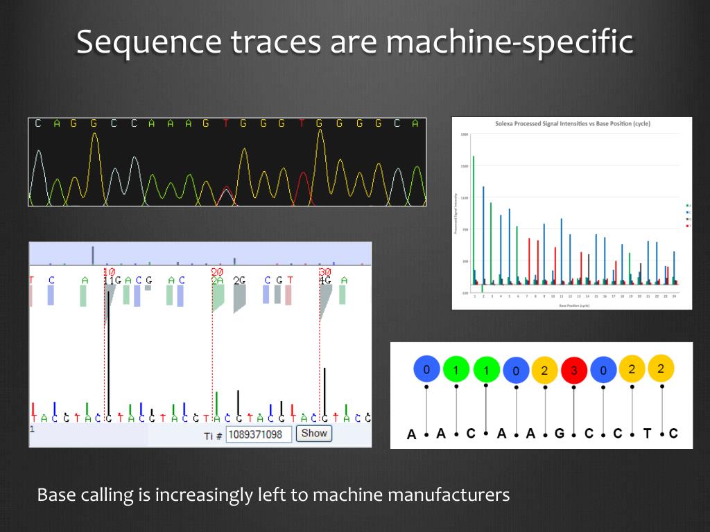 Sequence traces are machine-specific Base calling is increasingly left to machine manufacturers