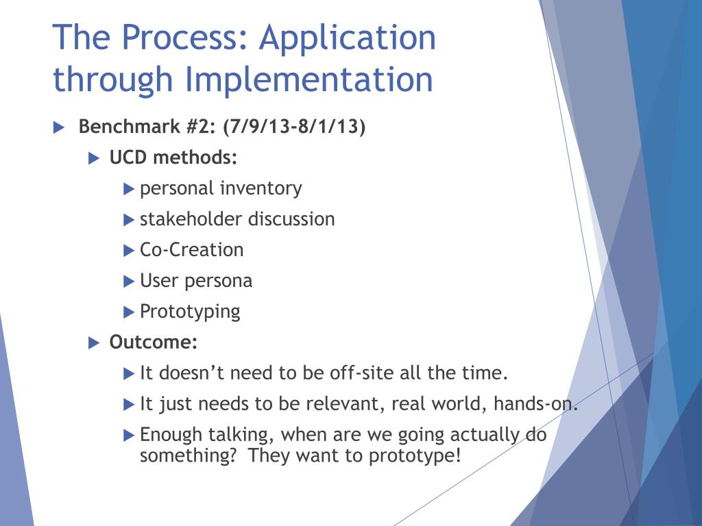 The Process: Application through Implementation • Benchmark #2: (7/9/13-8/1/13) • UCD methods: • personal inventory • stakeholder discussion • Co-Creation • User persona • Prototyping • Outcome: • It doesn’t need to be off-site all the time. • It just needs to be relevant, real world, hands-on. • Enough talking, when are we going actually do something? They want to prototype!