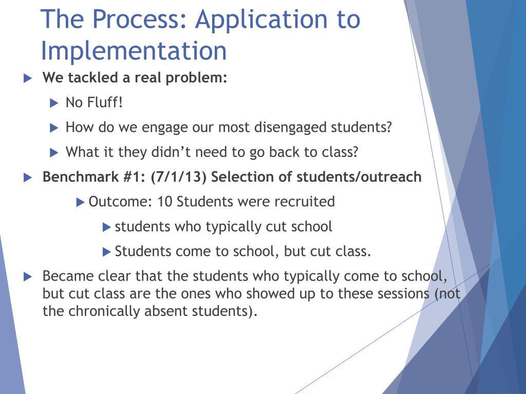 The Process: Application to Implementation • We tackled a real problem: • No Fluff! • How do we engage our most disengaged students? • What it they didn’t need to go back to class? • Benchmark #1: (7/1/13) Selection of students/outreach • Outcome: 10 Students were recruited • students who typically cut school • Students come to school, but cut class. • Became clear that the students who typically come to school, but cut class are the ones who showed up to these sessions (not the chronically absent students).