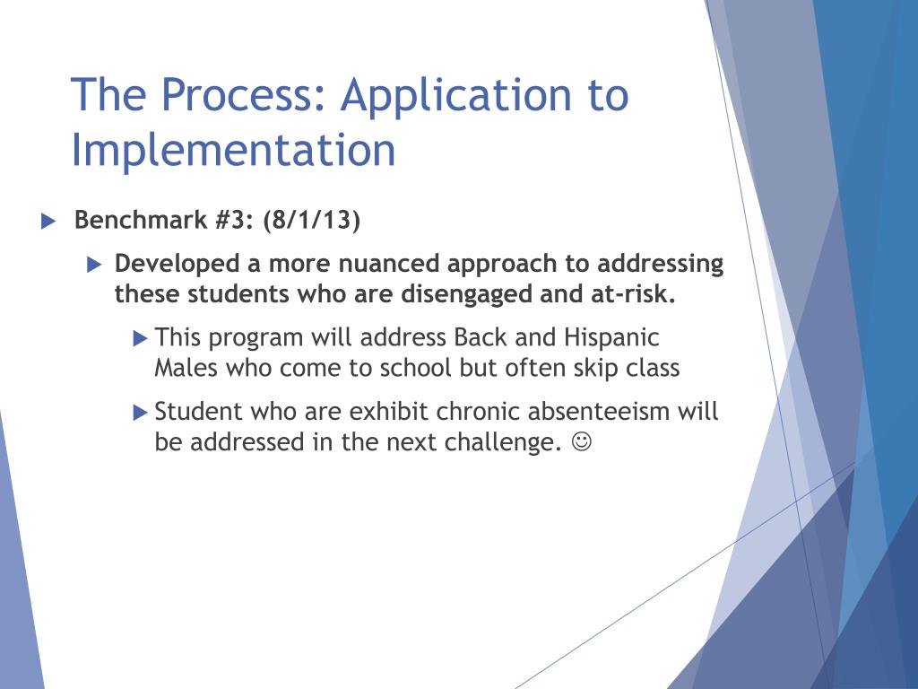 The Process: Application to Implementation • Benchmark #3: (8/1/13) • Developed a more nuanced approach to addressing these students who are disengaged and at-risk. • This program will address Back and Hispanic Males who come to school but often skip class • Student who are exhibit chronic absenteeism will be addressed in the next challenge.