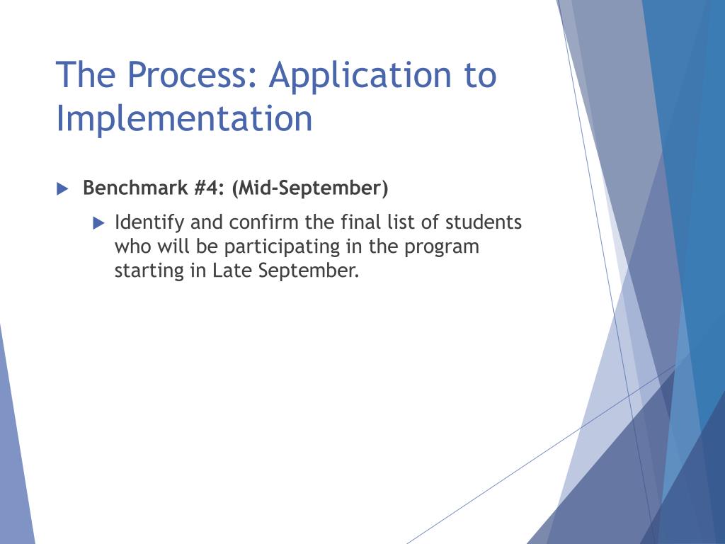 The Process: Application to Implementation • Benchmark #4: (Mid-September) • Identify and confirm the final list of students who will be participating in the program starting in Late September.