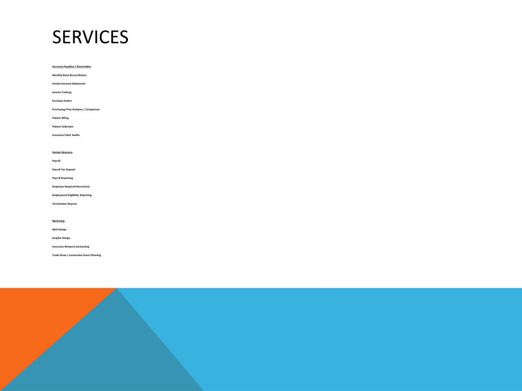 Services • Accounts Payables / Receivables • Monthly Bank Reconciliation • Vendor Account Statements • Invoice Tracking • Purchase Orders • Purchasing Price Analyses / Comparison • Patient Billing • Patient Collection • Insurance Claim Audits • Human Resource • Payroll • Payroll Tax Deposit • Payroll Reporting • Employee Required Documents • Employment Eligibility Reporting • Termination Reports • Marketing • Web Design • Graphic Design • Insurance Network Contracting • Trade Show / Convention Event Planning