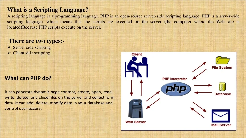 What is a Scripting Language? • A scripting language is a programming language. PHP is an open-source server-side scripting language. PHP is a server-side scripting language, which means that the scripts are executed on the server (the computer where the Web site is located)Because PHP scripts execute on the server. • There are two types:- • Server side scripting • Client side scripting What can PHP do? It can generate dynamic page content, create, open, read, write, delete, and close files on the server and collect form data. It can add, delete, modify data in your database and control user-access.