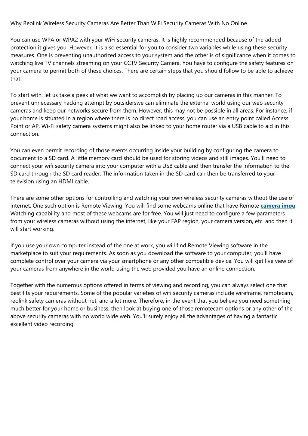 Why Reolink Wireless Security Cameras Are Better Than WiFi Security Cameras With No Online You can use WPA or WPA2 with your WiFi security cameras. It is highly recommended because of the added protection it gives you. However, it is also essential for you to consider two variables while using these security measures. One is preventing unauthorized access to your system and the other is of significance when it comes to watching live TV channels streaming on your CCTV Security Camera. You have to configure the safety features on your camera to permit both of these choices. There are certain steps that you should follow to be able to achieve that. To start with, let us take a peek at what we want to accomplish by placing up our cameras in this manner. To prevent unnecessary hacking attempt by outsiderswe can eliminate the external world using our web security cameras and keep our networks secure from them. However, this may not be possible in all areas. For instance, if your home is situated in a region where there is no direct road access, you can use an entry point called Access Point or AP. Wi-Fi safety camera systems might also be linked to your home router via a USB cable to aid in this connection. You can even permit recording of those events occurring inside your building by configuring the camera to document to a SD card. A little memory card should be used for storing videos and still images. You'll need to connect your wifi security camera into your computer with a USB cable and then transfer the information to the SD card through the SD card reader. The information taken in the SD card can then be transferred to your television using an HDMI cable. There are some other options for controlling and watching your own wireless security cameras without the use of internet. One such option is Remote Viewing. You will find some webcams online that have Remote camera imou Watching capability and most of these webcams are for free. You will just need to configure a few parameters from your wireless cameras without using the internet, like your FAP region, your camera version, etc. and then it will start working. If you use your own computer instead of the one at work, you will find Remote Viewing software in the marketplace to suit your requirements. As soon as you download the software to your computer, you'll have complete control over your camera via your smartphone or any other compatible device. You will get live view of your cameras from anywhere in the world using the web provided you have an online connection. Together with the numerous options offered in terms of viewing and recording, you can always select one that best fits your requirements. Some of the popular varieties of wifi security cameras include wireframe, remotecam, reolink safety cameras without net, and a lot more. Therefore, in the event that you believe you need something much better for your home or business, then look at buying one of those remotecam options or any other of the above security cameras with no world wide web. You'll surely enjoy all the advantages of having a fantastic excellent video recording.