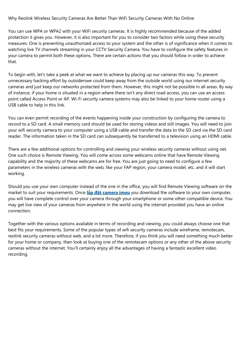 Why Reolink Wireless Security Cameras Are Better Than WiFi Security Cameras With No Online You can use WPA or WPA2 with your WiFi security cameras. It is highly recommended because of the added protection it gives you. However, it is also important for you to consider two factors while using these security measures. One is preventing unauthorized access to your system and the other is of significance when it comes to watching live TV channels streaming in your CCTV Security Camera. You have to configure the safety features in your camera to permit both these options. There are certain actions that you should follow in order to achieve that. To begin with, let's take a peek at what we want to achieve by placing up our cameras this way. To prevent unnecessary hacking effort by outsiderswe could keep away from the outside world using our internet security cameras and just keep our networks protected from them. However, this might not be possible in all areas. By way of instance, if your home is situated in a region where there isn't any direct road access, you can use an access point called Access Point or AP. Wi-Fi security camera systems may also be linked to your home router using a USB cable to help in this link. You can even permit recording of the events happening inside your construction by configuring the camera to record to a SD card. A small memory card should be used for storing videos and still images. You will need to join your wifi security camera to your computer using a USB cable and transfer the data to the SD card via the SD card reader. The information taken in the SD card can subsequently be transferred to a television using an HDMI cable. There are a few additional options for controlling and viewing your wireless security cameras without using net. One such choice is Remote Viewing. You will come across some webcams online that have Remote Viewing capability and the majority of these webcams are for free. You are just going to need to configure a few parameters in the wireless cameras with the web, like your FAP region, your camera model, etc. and it will start working. Should you use your own computer instead of the one in the office, you will find Remote Viewing software on the market to suit your requirements. Once lắp đặt camera imou you download the software to your own computer, you will have complete control over your camera through your smartphone or some other compatible device. You may get live view of your cameras from anywhere in the world using the internet provided you have an online connection. Together with the various options available in terms of recording and viewing, you could always choose one that best fits your requirements. Some of the popular types of wifi security cameras include wireframe, remotecam, reolink security cameras without web, and a lot more. Therefore, if you think you will need something much better for your home or company, then look at buying one of the remotecam options or any other of the above security cameras without the internet. You'll certainly enjoy all the advantages of having a fantastic excellent video recording.