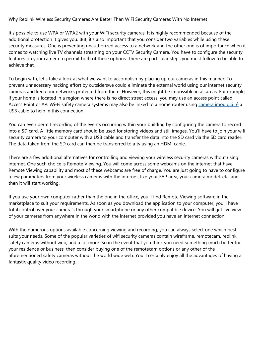 Why Reolink Wireless Security Cameras Are Better Than WiFi Security Cameras With No Internet It's possible to use WPA or WPA2 with your WiFi security cameras. It is highly recommended because of the additional protection it gives you. But, it's also important that you consider two variables while using these security measures. One is preventing unauthorized access to a network and the other one is of importance when it comes to watching live TV channels streaming on your CCTV Security Camera. You have to configure the security features on your camera to permit both of these options. There are particular steps you must follow to be able to achieve that. To begin with, let's take a look at what we want to accomplish by placing up our cameras in this manner. To prevent unnecessary hacking effort by outsiderswe could eliminate the external world using our internet security cameras and keep our networks protected from them. However, this might be impossible in all areas. For example, if your home is located in a region where there is no direct street access, you may use an access point called Access Point or AP. Wi-Fi safety camera systems may also be linked to a home router using camera imou giá rẻ a USB cable to help in this connection. You can even permit recording of the events occurring within your building by configuring the camera to record into a SD card. A little memory card should be used for storing videos and still images. You'll have to join your wifi security camera to your computer with a USB cable and transfer the data into the SD card via the SD card reader. The data taken from the SD card can then be transferred to a tv using an HDMI cable. There are a few additional alternatives for controlling and viewing your wireless security cameras without using internet. One such choice is Remote Viewing. You will come across some webcams on the internet that have Remote Viewing capability and most of these webcams are free of charge. You are just going to have to configure a few parameters from your wireless cameras with the internet, like your FAP area, your camera model, etc. and then it will start working. If you use your own computer rather than the one in the office, you'll find Remote Viewing software in the marketplace to suit your requirements. As soon as you download the application to your computer, you'll have total control over your camera's through your smartphone or any other compatible device. You will get live view of your cameras from anywhere in the world with the internet provided you have an internet connection. With the numerous options available concerning viewing and recording, you can always select one which best suits your needs. Some of the popular varieties of wifi security cameras contain wireframe, remotecam, reolink safety cameras without web, and a lot more. So in the event that you think you need something much better for your residence or business, then consider buying one of the remotecam options or any other of the aforementioned safety cameras without the world wide web. You'll certainly enjoy all the advantages of having a fantastic quality video recording.