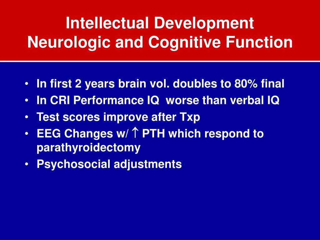 Intellectual DevelopmentNeurologic and Cognitive Function • In first 2 years brain vol. doubles to 80% final • In CRI Performance IQ worse than verbal IQ • Test scores improve after Txp • EEG Changes w/ PTH which respond to parathyroidectomy • Psychosocial adjustments