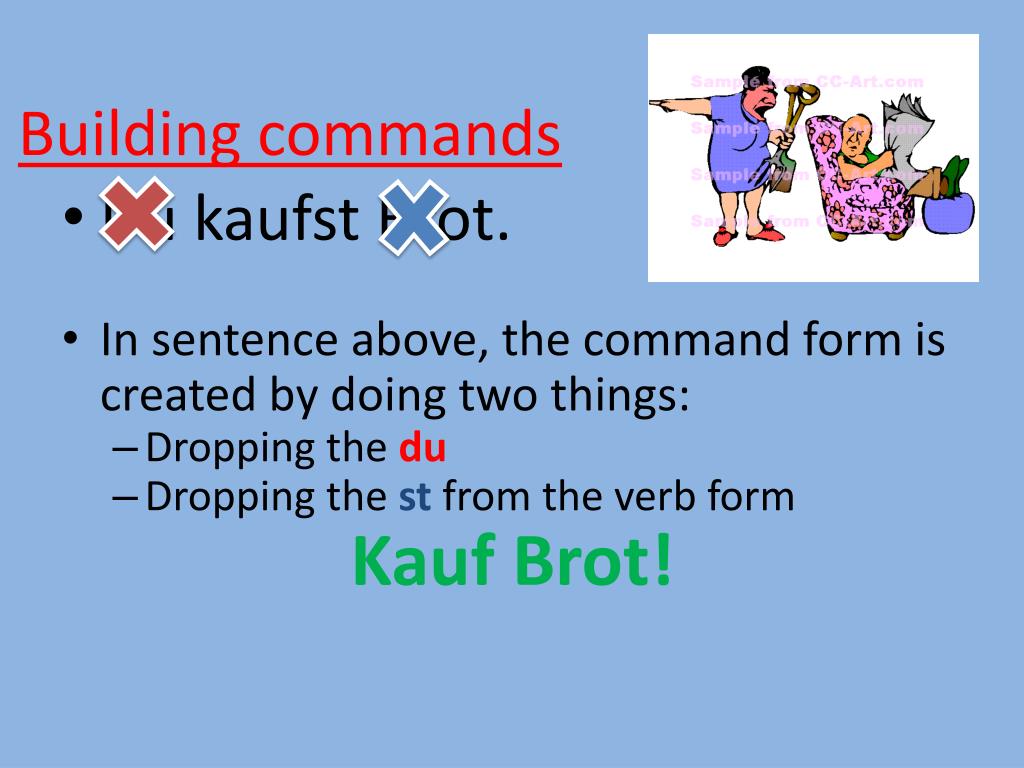 Building commands • Du kaufstBrot. • In sentence above, the command form is created by doing two things: • Dropping the du • Dropping the st from the verb form KaufBrot!