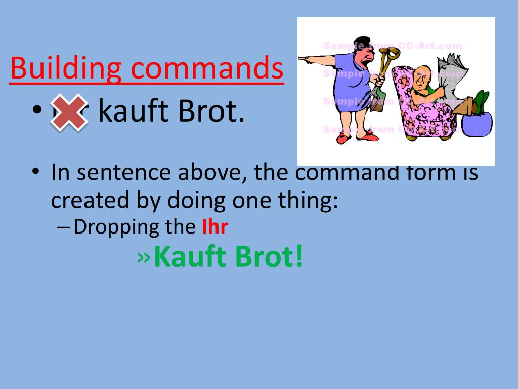 Building commands • Ihr kauft Brot. • In sentence above, the command form is created by doing one thing: • Dropping the Ihr • Kauft Brot!