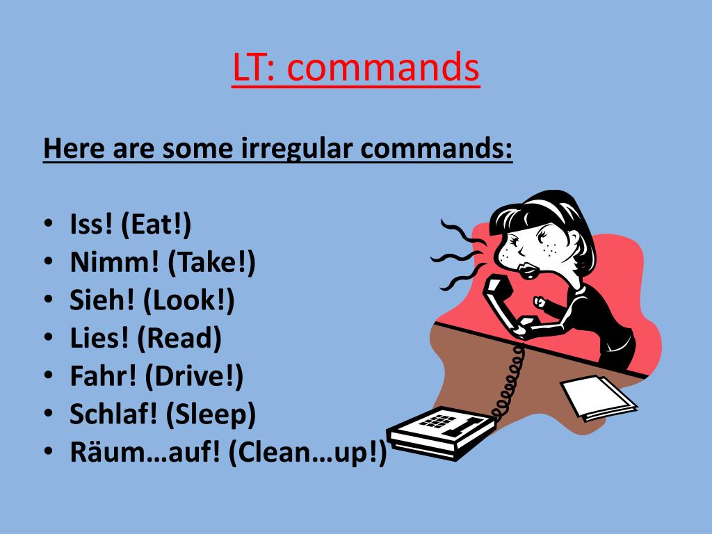 LT: commands Here are some irregular commands: • Iss! (Eat!) • Nimm! (Take!) • Sieh! (Look!) • Lies! (Read) • Fahr! (Drive!) • Schlaf! (Sleep) • Räum…auf! (Clean…up!)