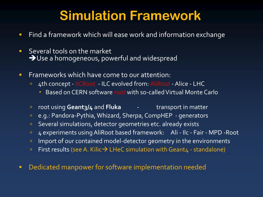 Simulation Framework • Find a framework which will ease work and information exchange • Several tools on the market Use a homogeneous, powerful and widespread • Frameworks which have come to our attention: • 4th concept - IlCRoot - ILC evolved from: AliRoot -Alice - LHC • Based on CERN software rootwith so-called Virtual Monte Carlo • root using Geant3/4 and Fluka - transport in matter • e.g.: Pandora-Pythia, Whizard, Sherpa, CompHEP - generators • Several simulations, detector geometries etc. already exists • 4 experiments using AliRoot based framework: Ali - Ilc - Fair - MPD -Root • Import of our contained model-detector geometry in the environments • First results (see A. Kilic LHeC simulation with Geant4 - standalone) • Dedicated manpower for software implementation needed