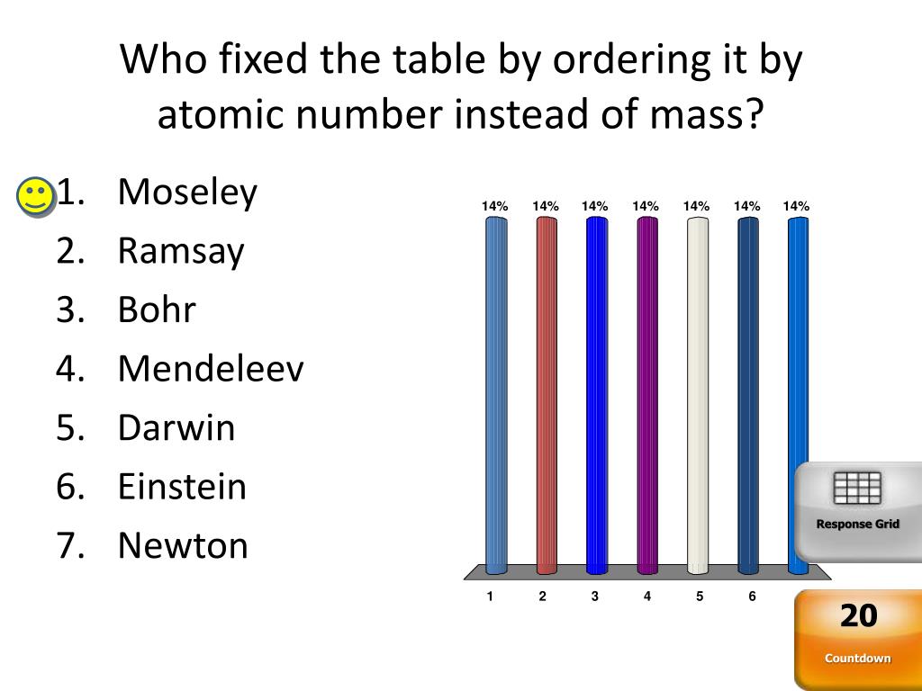 Who fixed the table by ordering it by atomic number instead of mass? • Moseley • Ramsay • Bohr • Mendeleev • Darwin • Einstein • Newton Response Grid 20 Countdown