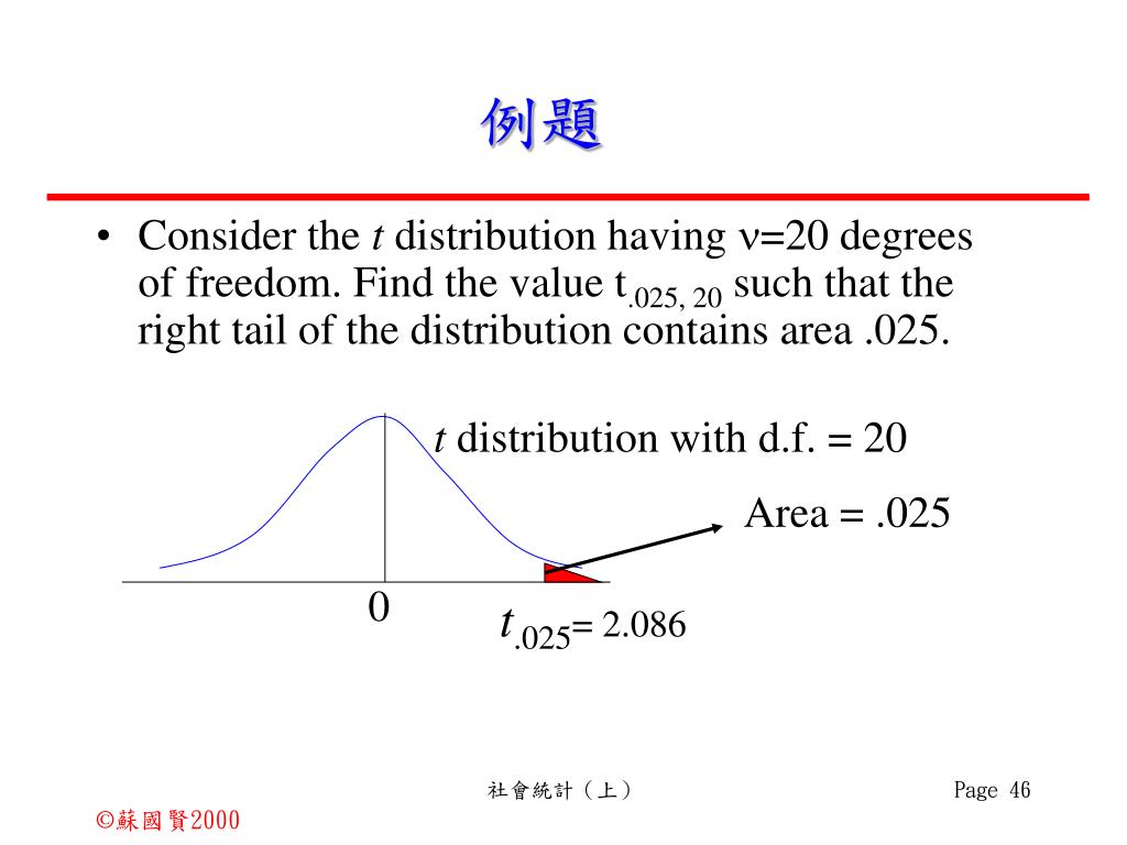 例題 • Consider the t distribution having =20 degrees of freedom. Find the value t.025, 20 such that the right tail of the distribution contains area .025. t distribution with d.f. = 20 Area = .025 0 t.025= 2.086 社會統計(上)