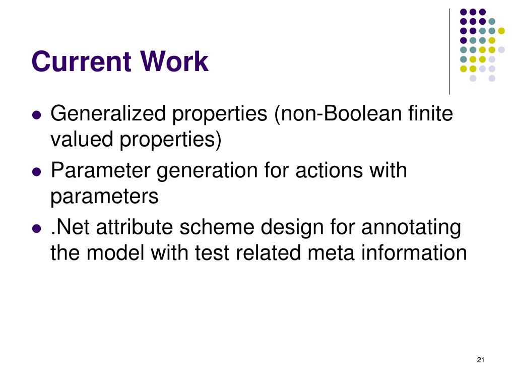 Current Work • Generalized properties (non-Boolean finite valued properties) • Parameter generation for actions with parameters • .Net attribute scheme design for annotating the model with test related meta information