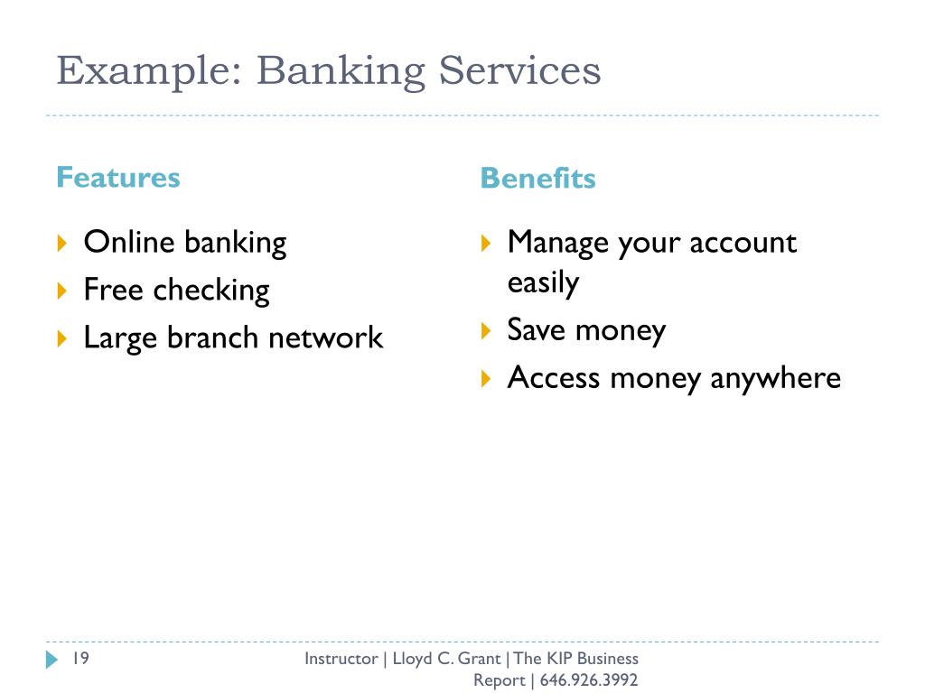 Example: Banking Services Features Benefits • Online banking • Free checking • Large branch network • Manage your account easily • Save money • Access money anywhere Instructor | Lloyd C. Grant | The KIP Business Report | 646.926.3992