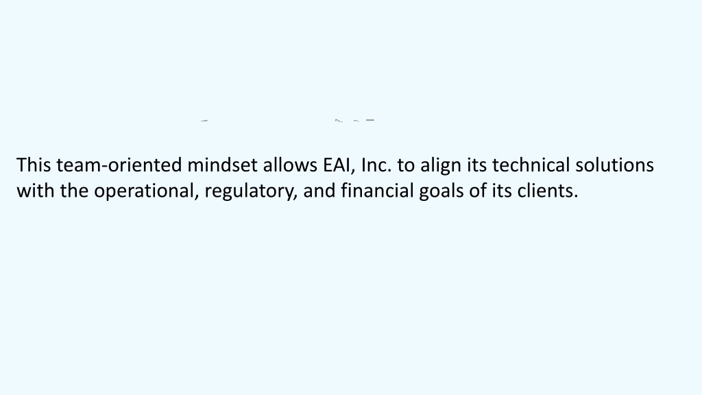 This team-oriented mindset allows EAI, Inc. to align its technical solutions with the operational, regulatory, and financial goals of its clients.