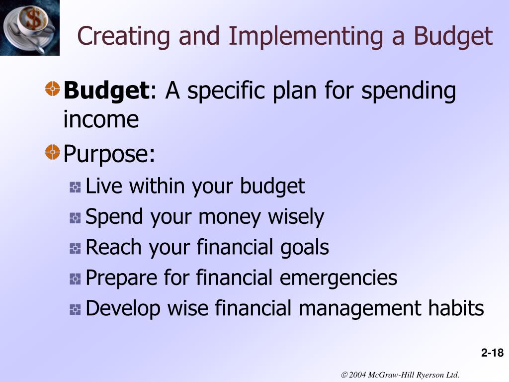 Creating and Implementing a Budget • Budget: A specific plan for spending income • Purpose: • Live within your budget • Spend your money wisely • Reach your financial goals • Prepare for financial emergencies • Develop wise financial management habits 2-18