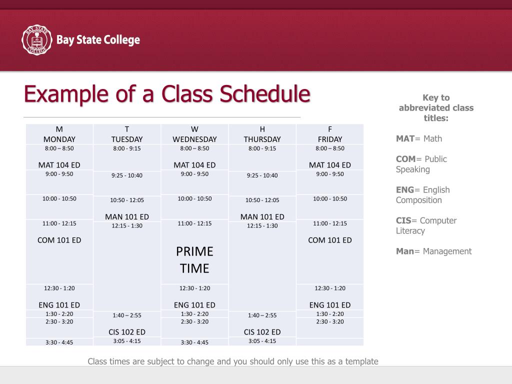 Key to abbreviated class titles: MAT= Math COM= Public Speaking ENG= English Composition CIS= Computer Literacy Man= Management Example of a Class Schedule Class times are subject to change and you should only use this as a template