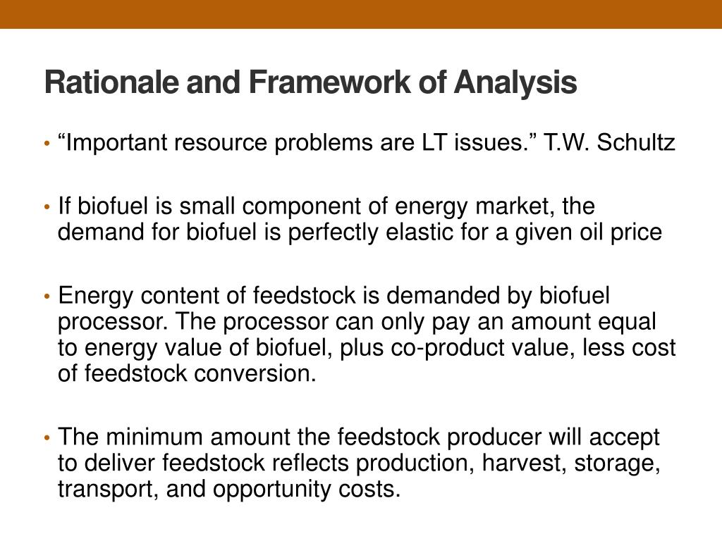 Rationale and Framework of Analysis • “Important resource problems are LT issues.” T.W. Schultz • If biofuel is small component of energy market, the demand for biofuel is perfectly elastic for a given oil price • Energy content of feedstock is demanded by biofuel processor. The processor can only pay an amount equal to energy value of biofuel, plus co-product value, less cost of feedstock conversion. • The minimum amount the feedstock producer will accept to deliver feedstock reflects production, harvest, storage, transport, and opportunity costs.