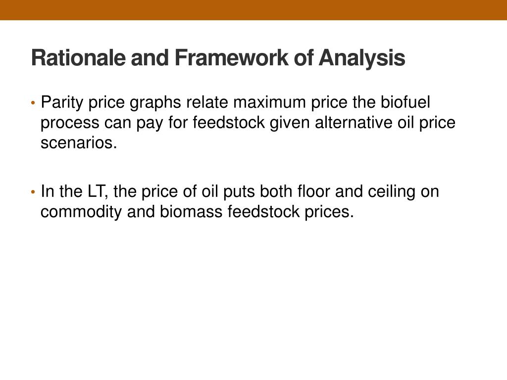 Rationale and Framework of Analysis • Parity price graphs relate maximum price the biofuel process can pay for feedstock given alternative oil price scenarios. • In the LT, the price of oil puts both floor and ceiling on commodity and biomass feedstock prices.