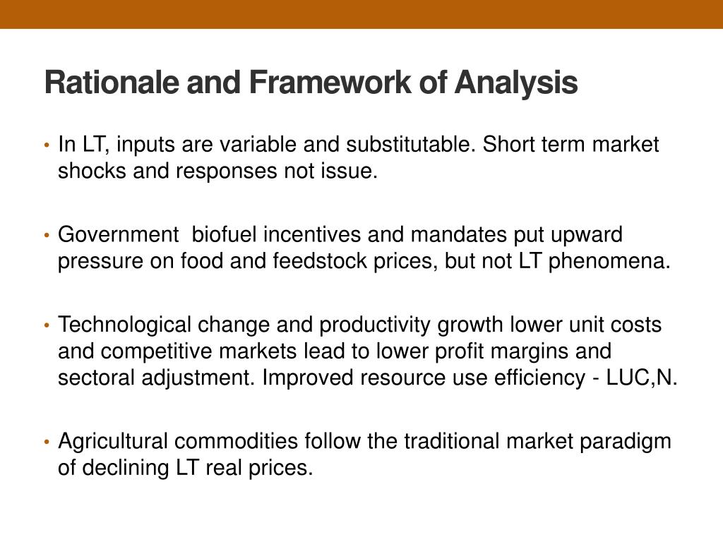 Rationale and Framework of Analysis • In LT, inputs are variable and substitutable. Short term market shocks and responses not issue. • Government biofuel incentives and mandates put upward pressure on food and feedstock prices, but not LT phenomena. • Technological change and productivity growth lower unit costs and competitive markets lead to lower profit margins and sectoral adjustment. Improved resource use efficiency - LUC,N. • Agricultural commodities follow the traditional market paradigm of declining LT real prices.