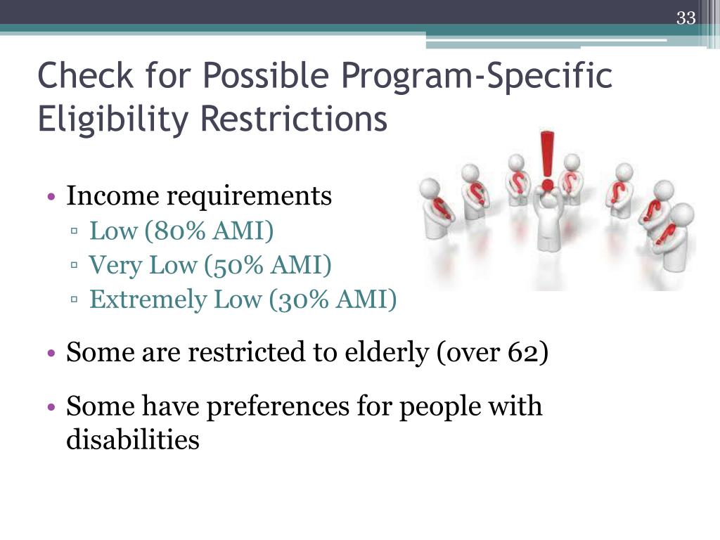 Check for Possible Program-Specific Eligibility Restrictions • Income requirements • Low (80% AMI) • Very Low (50% AMI) • Extremely Low (30% AMI) • Some are restricted to elderly (over 62) • Some have preferences for people with disabilities