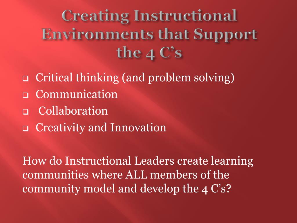 Creating Instructional Environments that Support the 4 C’s • Critical thinking (and problem solving) • Communication • Collaboration • Creativity and Innovation How do Instructional Leaders create learning communities where ALL members of the community model and develop the 4 C’s?