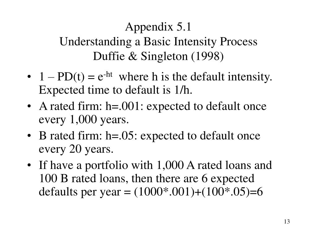 Appendix 5.1Understanding a Basic Intensity ProcessDuffie & Singleton (1998) • 1 – PD(t) = e-ht where h is the default intensity. Expected time to default is 1/h. • A rated firm: h=.001: expected to default once every 1,000 years. • B rated firm: h=.05: expected to default once every 20 years. • If have a portfolio with 1,000 A rated loans and 100 B rated loans, then there are 6 expected defaults per year = (1000*.001)+(100*.05)=6