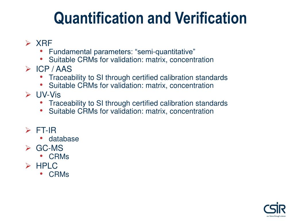 Quantification and Verification • XRF • Fundamental parameters: “semi-quantitative” • Suitable CRMs for validation: matrix, concentration • ICP / AAS • Traceability to SI through certified calibration standards • Suitable CRMs for validation: matrix, concentration • UV-Vis • Traceability to SI through certified calibration standards • Suitable CRMs for validation: matrix, concentration • FT-IR • database • GC-MS • CRMs • HPLC • CRMs