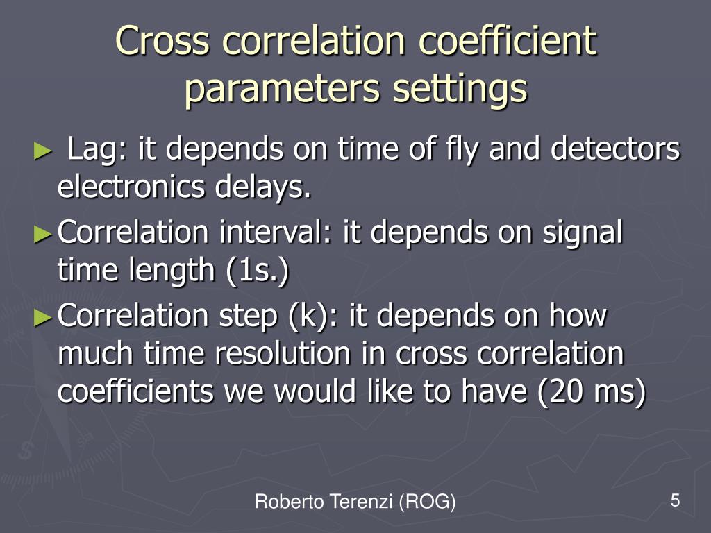 Cross correlation coefficient parameters settings • Lag: it depends on time of fly and detectors electronics delays. • Correlation interval: it depends on signal time length (1s.) • Correlation step (k): it depends on how much time resolution in cross correlation coefficients we would like to have (20 ms) Roberto Terenzi (ROG)