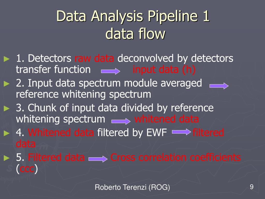 Data Analysis Pipeline 1 data flow • 1. Detectors raw data deconvolved by detectors transfer function input data (h) • 2. Input data spectrum module averaged reference whitening spectrum • 3. Chunk of input data divided by reference whitening spectrum whitened data • 4. Whitened data filtered by EWF filtered data • 5. Filtered data Cross correlation coefficients (ccc) Roberto Terenzi (ROG)
