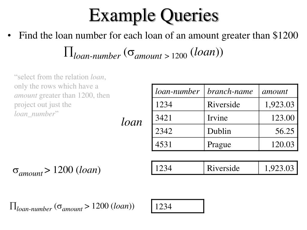 Example Queries • Find the loan number for each loan of an amount greater than $1200 loan-number (amount> 1200 (loan)) “select from the relation loan, only the rows which have a amount greater than 1200, then project out just the loan_number” loan amount> 1200 (loan) loan-number (amount> 1200 (loan))