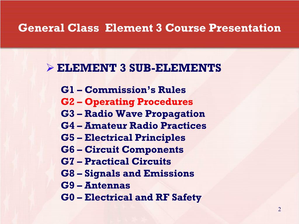 General Class Element 3 Course Presentation • ELEMENT 3 SUB-ELEMENTS G1 – Commission’s Rules G2 – Operating Procedures G3 – Radio Wave Propagation G4 – Amateur Radio Practices G5 – Electrical Principles G6 – Circuit Components G7 – Practical Circuits G8 – Signals and Emissions G9 – Antennas G0 – Electrical and RF Safety